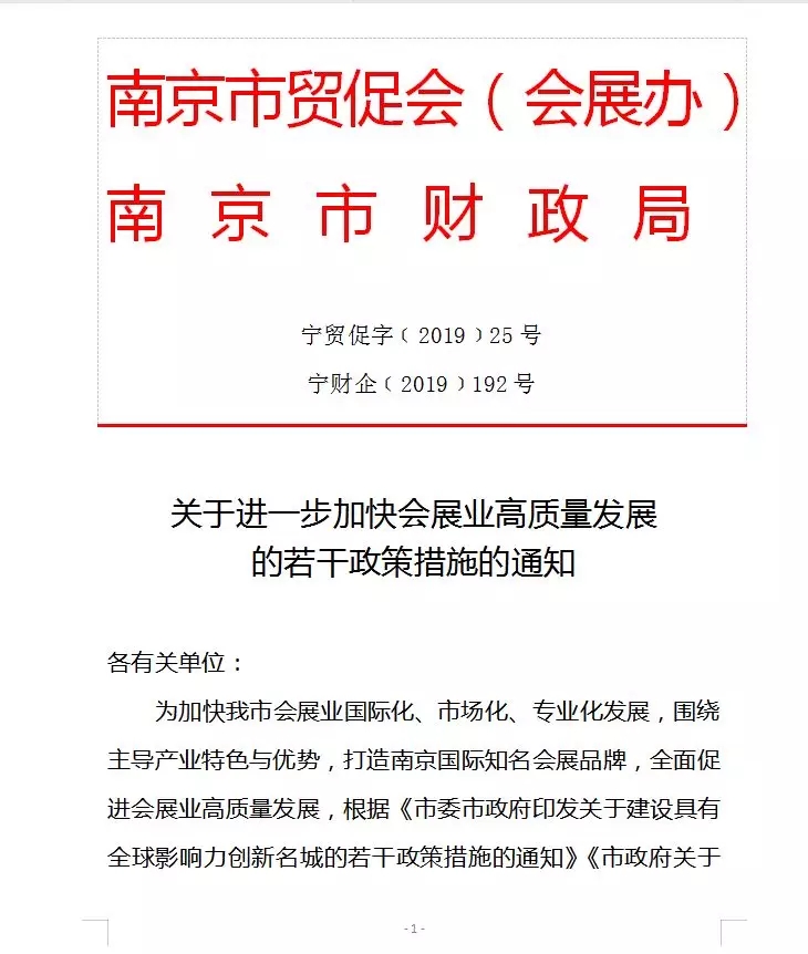 本政策措施自2019年1月1日起施行,具體執(zhí)行操作詳見(jiàn)《2019南京市進(jìn)一步加快會(huì)展業(yè)高質(zhì)量發(fā)展補(bǔ)助資金申報(bào)指南》。