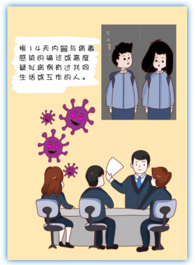 指14天內(nèi)曾與病毒感染的確診或高度疑似病例有過共同生活或工作的人。