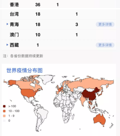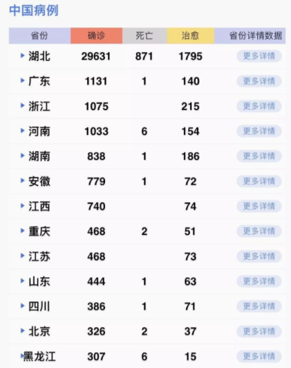 據(jù)31個?。ㄗ灾螀^(qū)、直轄市)和新疆生產(chǎn)建設(shè)兵團(tuán)報告,現(xiàn)有確診病例35982例(其中重癥病例6484例),累計治愈出院病例3281例,累計死亡病例908例,累計報告確診病例40171例(湖北核減87例,江西、甘肅各核減1例),現(xiàn)有疑似病例23589例。累計追蹤到密切接觸者399487人,尚在醫(yī)學(xué)觀察的密切接觸者187518人。