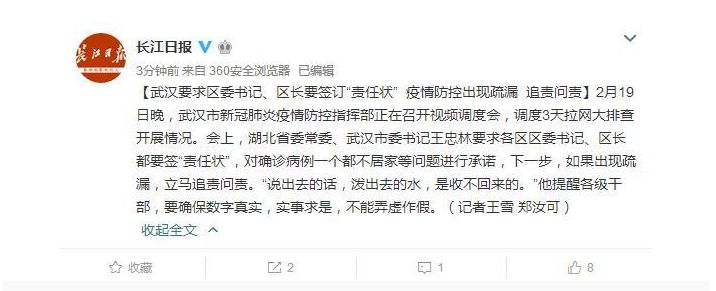 【武漢要求區(qū)委書記、區(qū)長(zhǎng)要簽訂“責(zé)任狀” 疫情防控出現(xiàn)疏漏 追責(zé)問責(zé)】2月19日晚,武漢市新冠肺炎疫情防控指揮部正在召開視頻調(diào)度會(huì),調(diào)度3天拉網(wǎng)大排查開展情況。會(huì)上,湖北省委常委、武漢市委書記王忠林要求各區(qū)區(qū)委書記、區(qū)長(zhǎng)都要簽“責(zé)任狀”,對(duì)確診病例一個(gè)都不居家等問題進(jìn)行承諾,下一步,如果出現(xiàn)疏漏,立馬追責(zé)問責(zé)。“說出去的話,潑出去的水,是收不回來的。”他提醒各級(jí)干部,要確保數(shù)字真實(shí),實(shí)事求是,不能弄虛作假。(記者王雪 鄭汝可)
