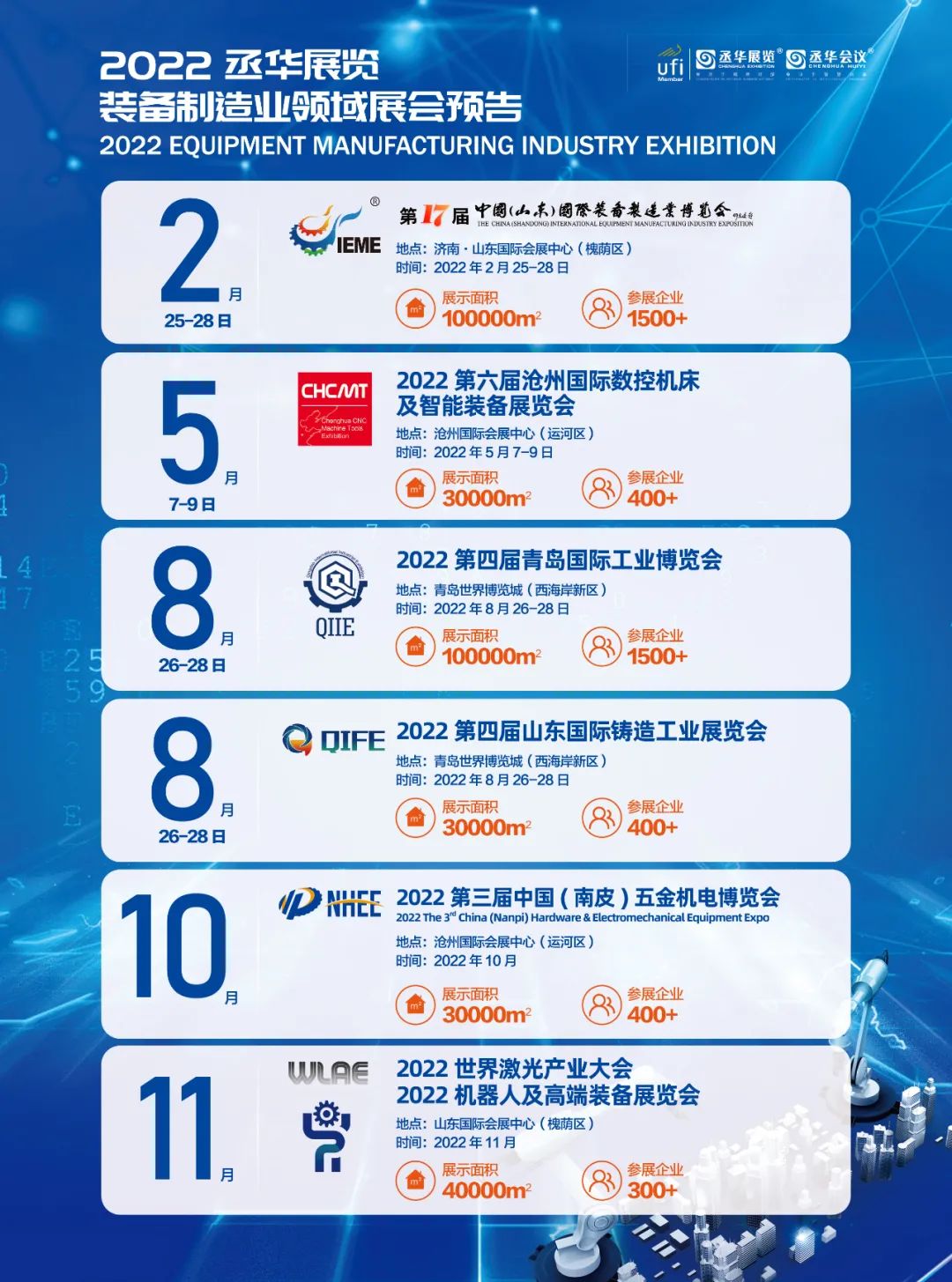2022第17屆中國(山東)國際裝備制造業(yè)博覽會定于2022年2月25-28日在山東國際會展中心(槐蔭區(qū))舉辦。開設8大展館(滿館),面積超過10萬平方米,重點展示數(shù)控機床、激光切割、工業(yè)自動化、工業(yè)機器人、智能裝備、功能部件等最新技術(shù)及產(chǎn)品,匯聚1500家參展企業(yè)同臺,主流品牌悉數(shù)亮相。